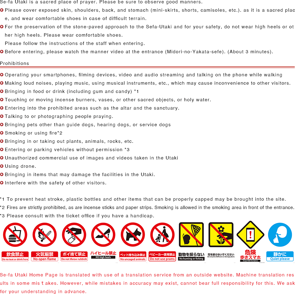 | Parking lot: | Up to 150 cars can park for free of charge. Parking space (approx. 150 cars) is at Ganju station in Nanjo and at Cape Chinen Park. 7-10 min (approx. 400 meters) walk from parking spaces to Sefa-utaki. |